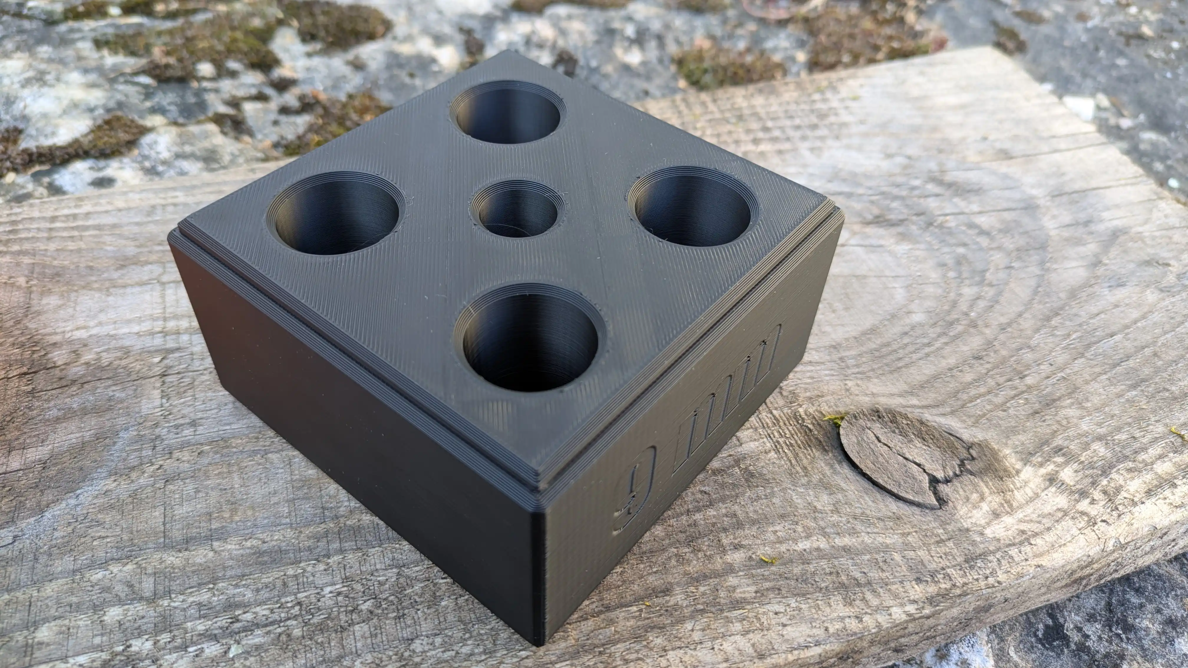 Le trou central, plus petit, accueille le shell holder (support de douille) du calibre correspondant. Plus besoin de le chercher dans un tiroir ou au fond d’une boîte : il est rangé avec le jeu d’outils, toujours prêt.